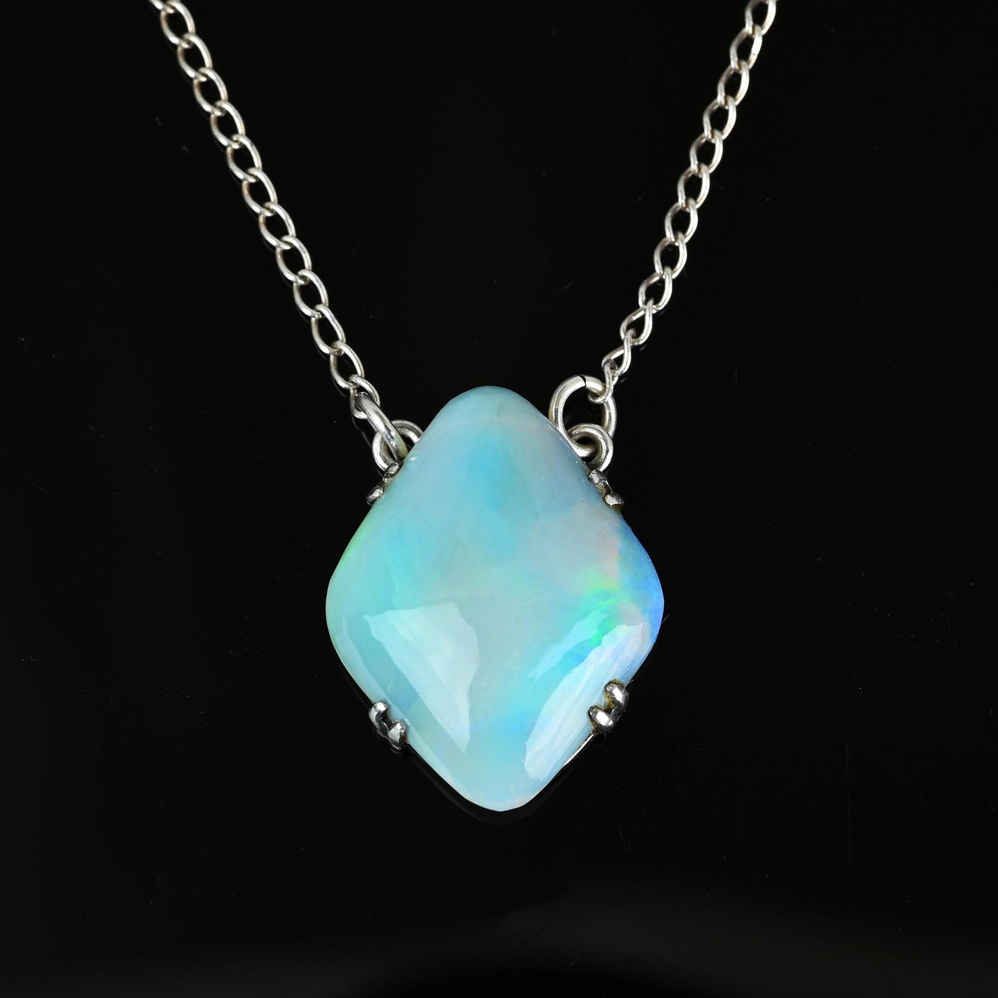 This stunning antique pendant necklace features a captivating 8 carat Australian opal with deep electric blue and green tones. Set in a simple sterling silver frame, the cabochon gemstone has a rectangular shape and is suspended from a fine 20 inch chain. A perfect choice for an anniversary, wedding, or unique birthday gift, this original piece of jewelry is sure to be cherished for years to come.