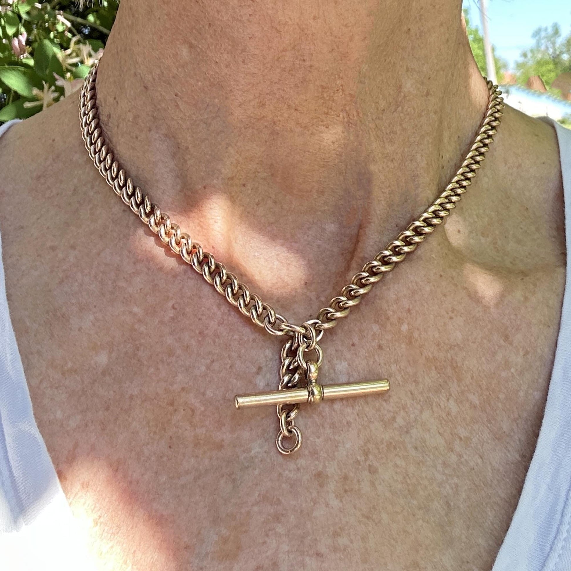 This antique Edwardian double Albert pocket watch chain is 16 inches in length, made of rich rolled gold. Its 5.4mm curb chain features a center t-bar and matching drop chain, with swivel dog clips on each end for attaching a fob. This versatile piece can be worn as a necklace, bracelet, or wrapped around the wrist for a unique look. Perfect for gentlemen to pair with a pocket watch, or for ladies to wear as a statement necklace.