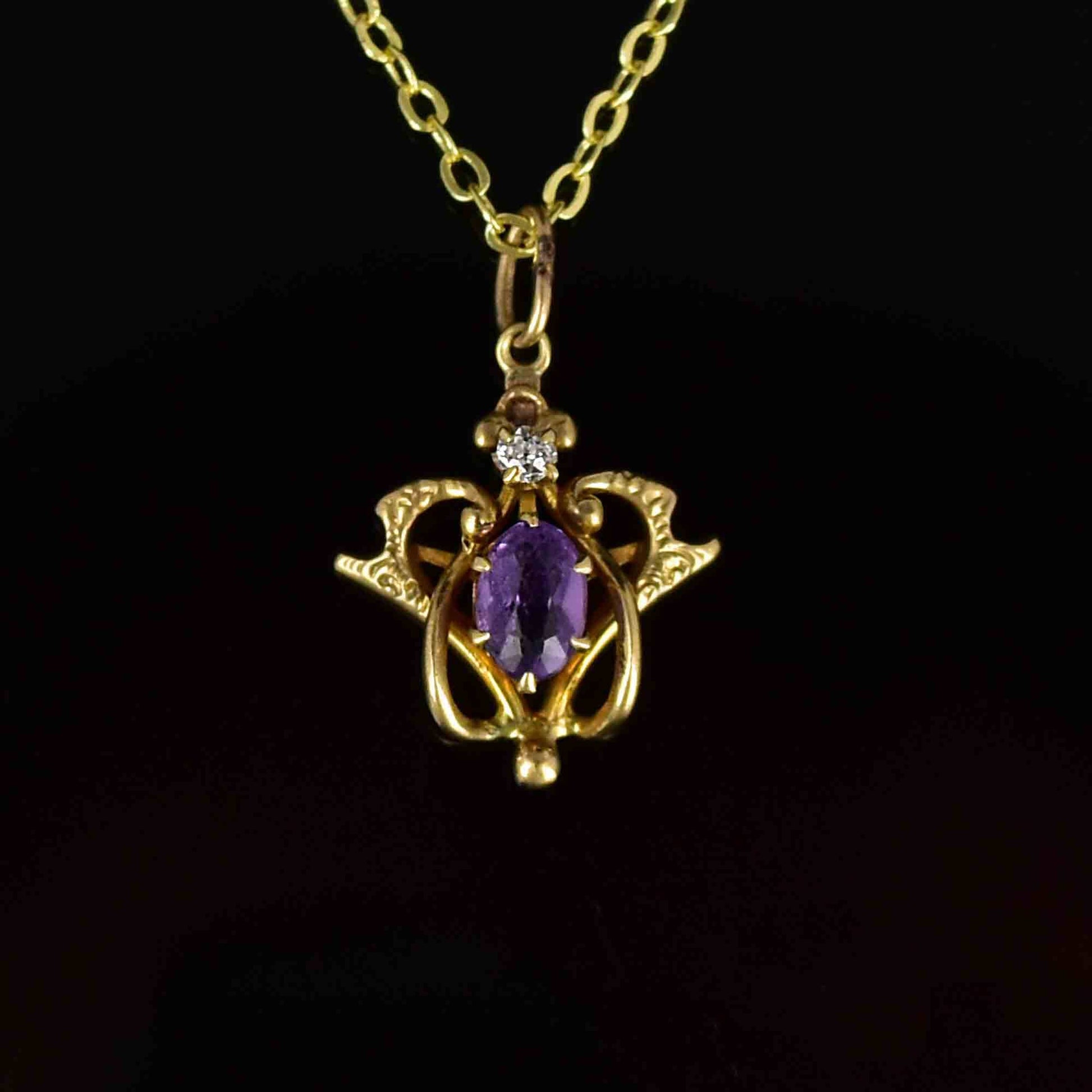 Antique Edwardian 14K Gold Diamond Amethyst Pendant Necklace