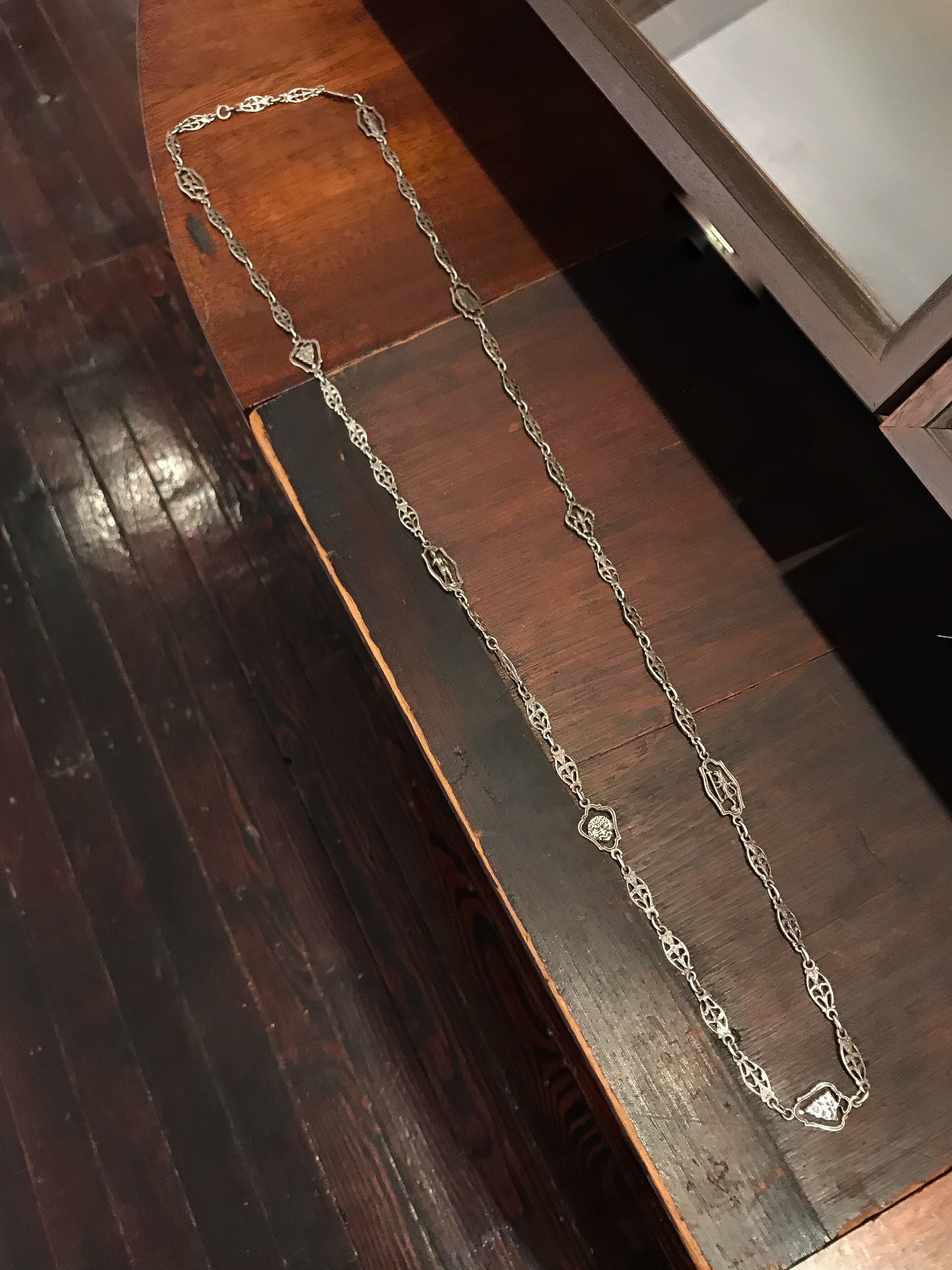 Love, love, LOVE these antique Italian chains!? I grab them every time I see them, and these super long ones are getting hard to find.? Gorgeous and ornate chains like this one were typically purchased as souvenirs from an Italian vacation.? This lovely and long chain appears to have been picked up on a trip to Florence, as it features floral links interspersed with noted Florentine art and symbols such as Michelangelo's David, the Lily of Florence, the Marzocco and Donatello's Saint George.? Perhaps this chain reminds you of your own special time in Florence?? Even if you haven't been, you can still enjoy this beautifully made chain--can be worn long in the Deco style or easily doubled!
