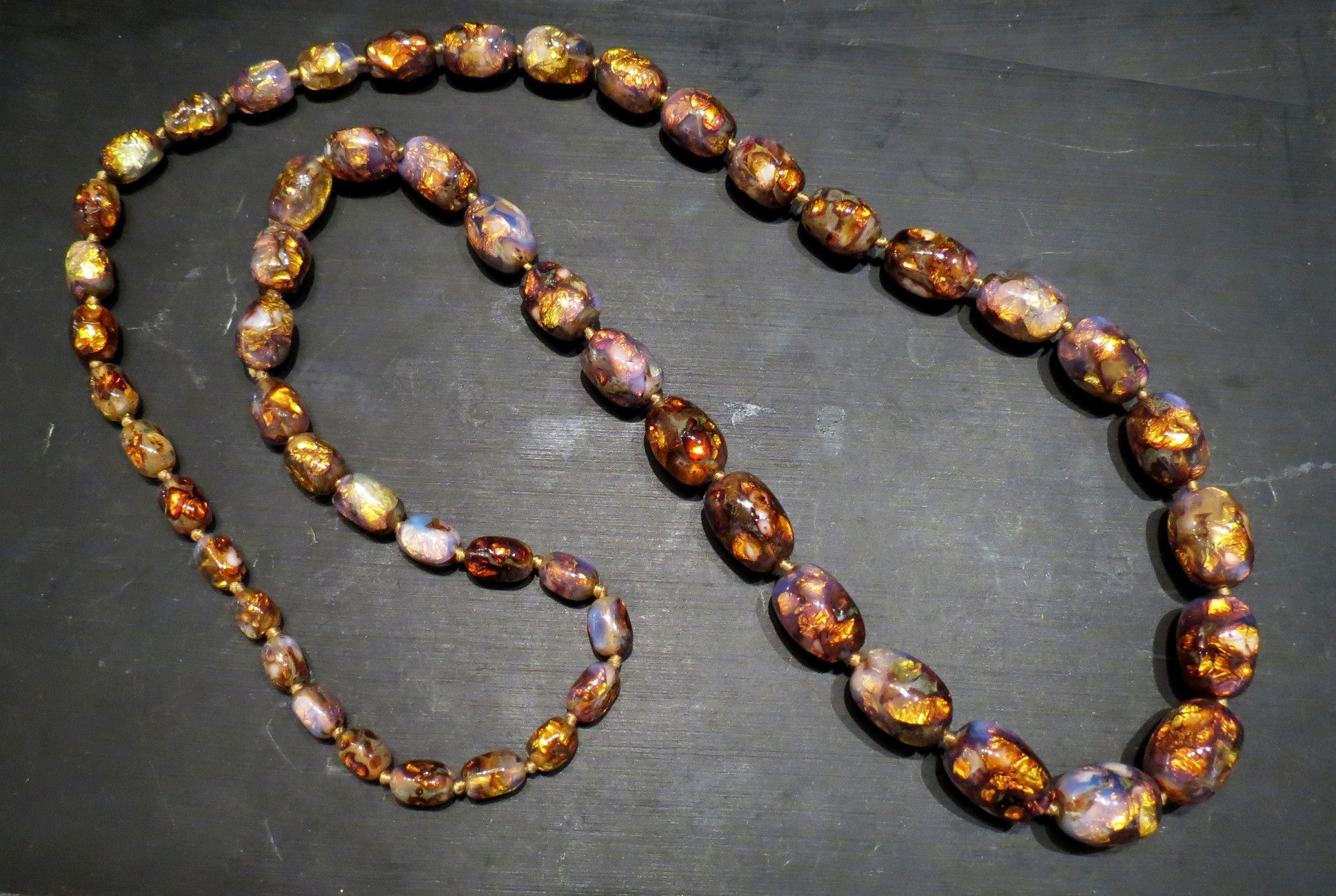 These incredible, gorgeous, luminous Art Deco era Venetian glass beads came from a serious collector who knows her beads.? She said they were the best she's ever seen and I would have to agree!? This necklace measures 32 in length and the beads graduate from 3/4 to 5/16 and are very heavy--this necklace not only looks but feels like a quality piece.? The beads are primarily gold and amber in color, but have flashes of violet, blue and pink for the most beautiful sunset-like contrast.? I don't think it is a stretch to say that these are probably the most beautiful Venetian glass beads in existence!? If you don't believe me, come in and judge for yourself--they will absolutely entrance you.?