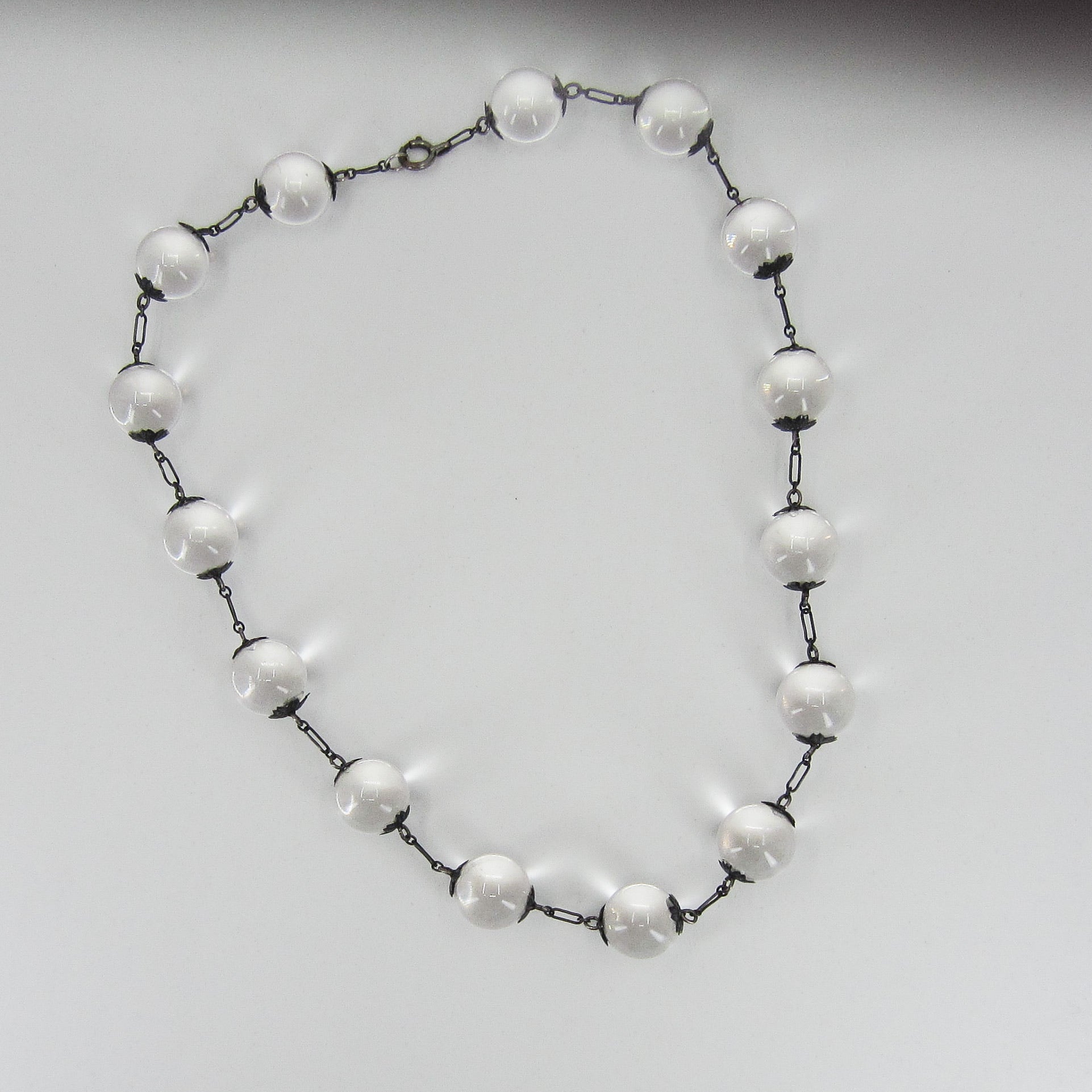 I found it very tough to capture a good photo of this necklace because it kept rolling all over the place!? The best and most accurate depiction of what this magical piece looks like in real life is the shot of it on.? They don't call them pools of light for nothing!? Made in the Art Deco era circa 1930, this necklace holds undrilled orb-shaped rock crystal quartz stones between floral bead caps.? Unincluded rock crystal, when fashioned as an orb, exhibits the most wonderful optical property when light hits it at the right angle--it glows!? Pools of light necklace were mostly imported from China during the late 1800's to late Deco period and are becoming very scarce.? Try one on and you will be hooked!
