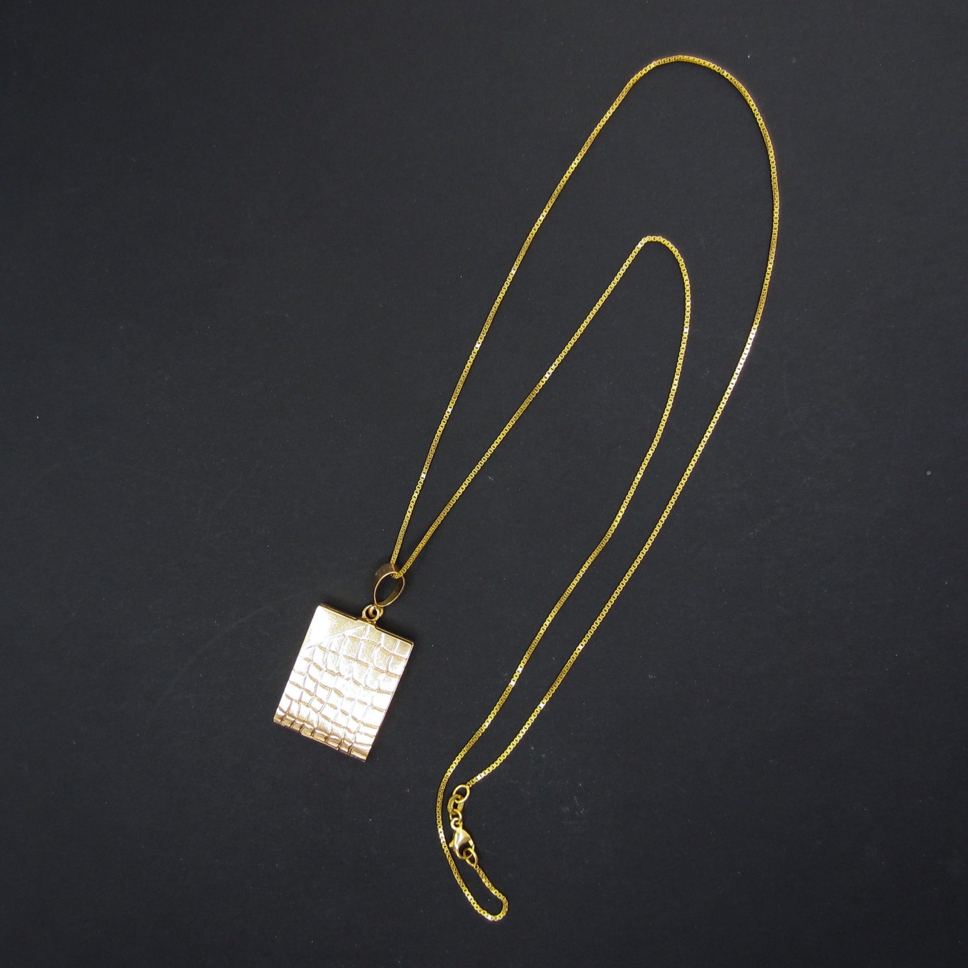 This is one of the chicest lockets I've seen in the long time!? This great piece was made circa 1960 with an alligator skin pattern in 14k gold.? It opens to reveal two compartments on the sides and one center compartment for photos for up to four photos.? It is a nice weight, very well-made and sits flat against the chest.? Suspended from a slinky 14k box chain.? Gorgeous!