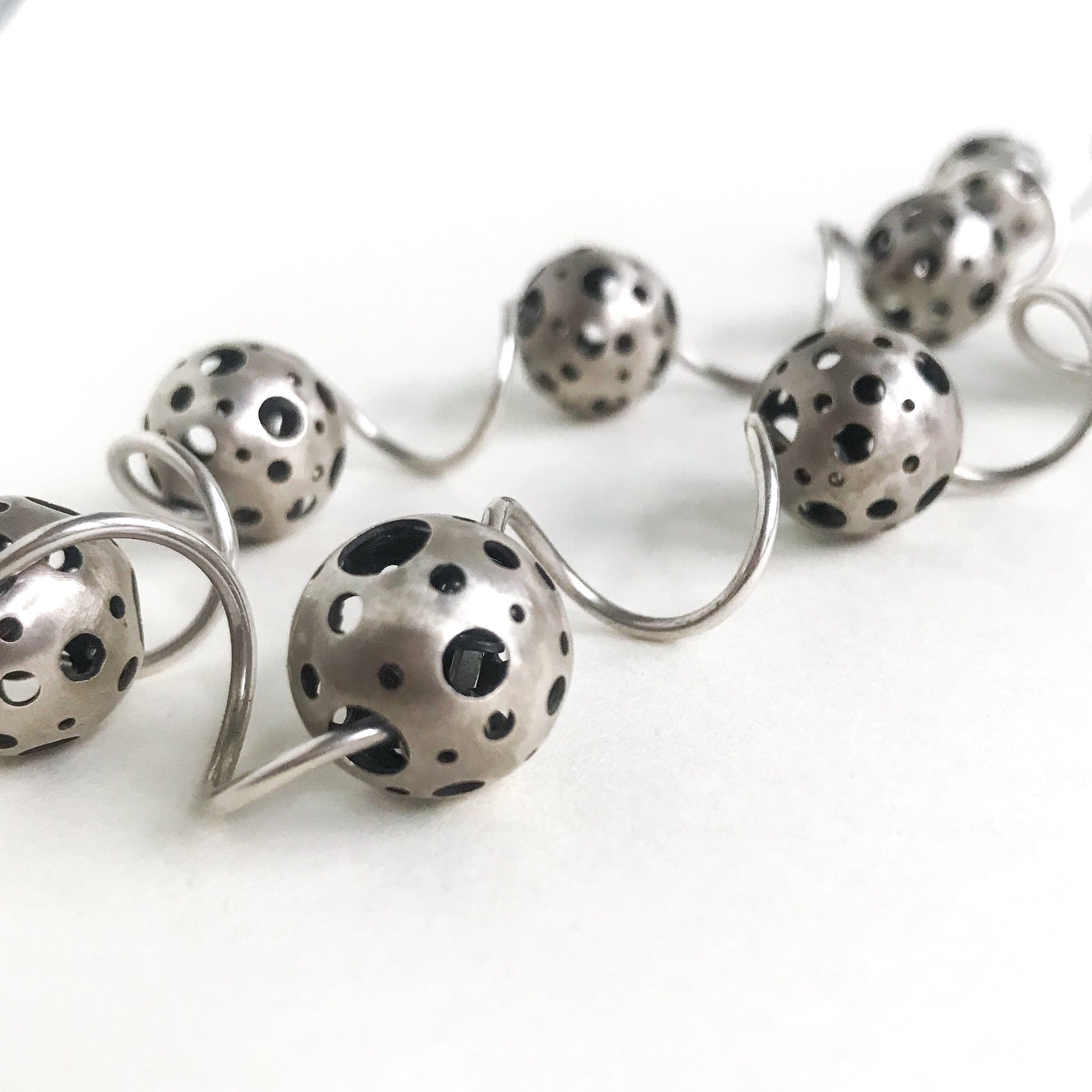 This whimsical necklace was made circa 1990's and features nine orbs with openwork polka dots?attached by spiral wires, all in sterling silver.? It's made in an interesting way--each spiral is interlocked in the orbs by a ball end, so the orbs stay at their stations and don't move up and down the necklace!? It's really great work.??